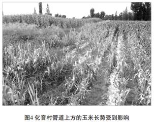 據農田承包者說(shuō), 油氣管道上方的地澆水后積水不滲。 調查組看到, 這里的玉米長(cháng)得稀疏低矮、 玉米棒小、 嚴重缺粒(圖3) 。