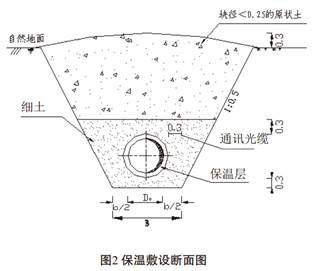 對于管底飽冰多年凍土層較厚,管底多年凍土融化呈可塑或硬塑地段、小型河流穿越地段,采取保溫敷設方式。管道敷設斷面圖如圖2所示。