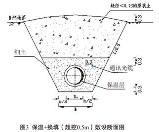 對于管底飽冰、含土冰層多年凍土層較厚,多年凍土融化后為軟塑、流塑狀態(tài)的地段,采取“保溫+換填”的敷設方式。管道敷設斷面圖如圖3所示。