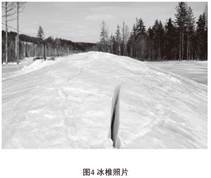 漠大管道出現過(guò)較大冰錐,并且成長(cháng)很快,3天內管道上方的冰面升高了約50cm,最高處相對于自然地面隆起約2.9米,表面冰層厚度約150cm,冰椎如圖4所示,地表裂紋嚴重。