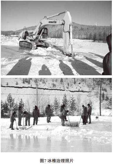 針對該冰椎的形成原因,采取了開(kāi)挖表層凍結面,將水流壓力泄放的措施,如圖7所示。為了更好地泄放水壓,防止未凍結水對冰椎的繼續補充,可以在泄放點(diǎn)修筑排水通道。泄放處的水在管道表面凍結,形成保溫層,可以阻止持續凍結。排水和保溫措施消除了凍脹的發(fā)生條件,保證了管道安全。