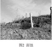 面蝕是由分散的地表徑流沖走坡面表層土粒的侵蝕現象, 凡是裸露的坡地表面, 都有不同程度的面蝕存在, 如圖2所示。 面蝕嚴重的區域大多分布在管道爬坡地段, 面蝕易造成管道上方覆土的流失, 造成管道和光纜埋深下降, 目前采取的措施是在邊坡坡面修建魚(yú)鱗坑和恢復植被。