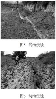 埋溝蝕是指由匯集成股的地表徑流沖刷、 破壞土壤及其母質(zhì), 切入地表以下形成溝壑的侵蝕形式, 又可以細分為淺溝侵蝕、 切溝侵蝕和沖溝侵蝕三類(lèi)(見(jiàn)圖5、 圖6、 圖7) 。