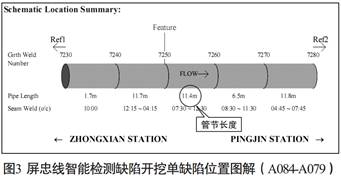 為了證實(shí)該焊縫是否是7250焊縫, 那我就要用到開(kāi)挖單的缺陷位置圖解部分。 見(jiàn)圖3, 圖中標注了每節管道的長(cháng)度, 因為地形及管道用材的原因, 有直管段、 彎頭、 短接, 每根管道長(cháng)度是有所差別的。 7250號焊縫的下游管節長(cháng)度是11.4米, 那么我們在距已開(kāi)挖焊縫位置下游11.4米進(jìn)行開(kāi)挖, 如果能夠挖到焊縫, 說(shuō)7250號焊縫查找成功, 當然, 缺陷點(diǎn)在距7250號焊縫下游0米位置, 我們就能成功找到焊縫位置。 另舉一個(gè)例子, 如果圖標顯示缺陷點(diǎn)在7250號焊縫下游2米處, 那我們在7250號焊縫下游2米處開(kāi)挖就能成功找到缺陷。