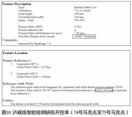 圖8中缺陷的管線(xiàn)里程為1002.808米, 通過(guò)列表查看我們發(fā)現, 在里程為1023.097處有一處40°彎頭(Bend 40 Deg) , 彎頭方向為朝下游方向上彎, 這個(gè)彎頭可能處于一個(gè)明顯爬坡點(diǎn)。 我們可以從64號馬克點(diǎn)朝上行進(jìn)70米左右(注: 92.728米減去(1023.097-1002.808)米) , 會(huì )很明顯的發(fā)現彎頭, 直接對彎頭進(jìn)行開(kāi)挖, 找到彎頭上游方向 0 . 4 8米處里程為1023.617米的焊縫(twin seamwelded start) ,從焊縫處朝上游方向準確測量20.809米, 直接開(kāi)挖, 缺陷點(diǎn)準確找到。