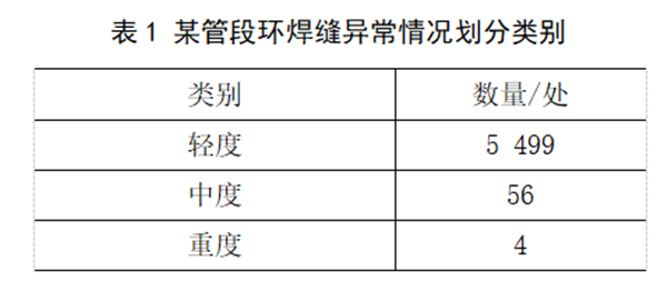 某輸氣管道管徑660 mm,系保障華中地區供氣安全的重要聯(lián)絡(luò )線(xiàn),于2011年投產(chǎn)。為摸清管道本體缺陷情況,按照法規和國家標準要求,西氣東輸管道公司委托專(zhuān)業(yè)管道內檢測單位于2013~2014年完成了漏磁管道內檢測,本次內檢測共計發(fā)現環(huán)焊縫異常5 559處,劃分類(lèi)別見(jiàn)表1。