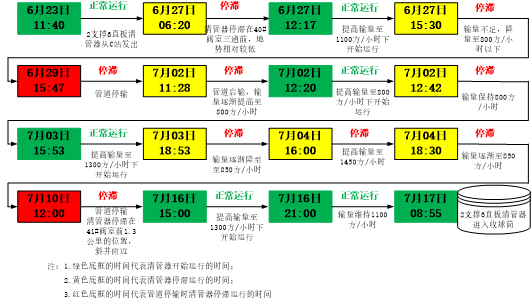 從C站發(fā)送的第四個(gè)清管器為兩支撐六直板清管器,于6月23日11:40發(fā)出,排量820方/小時(shí),壓力4.4MPa,溫度15℃;7月17日08:55進(jìn)鄭州站,清管器推出雜質(zhì)173公斤(主要為粗砂),過(guò)濾器累計清理4次共清除160公斤雜質(zhì)。具體的時(shí)間行進(jìn)表見(jiàn)下圖2。