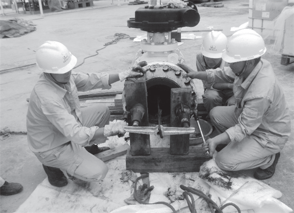 發(fā)送失敗后管理處組織維搶修人員打開(kāi)快開(kāi)盲板,試圖利用倒鏈外拉的辦法取出清管器,但沒(méi)能取出。之后,維搶修人員用火焊將發(fā)球筒支座斷開(kāi),并將MOV016、GV116A0235兩個(gè)球閥與排污閥斷開(kāi)。然后將發(fā)球筒及MOV016球閥整體拆卸吊裝至平坦地方,利用千斤頂將清管器取出(如圖3 所示)。