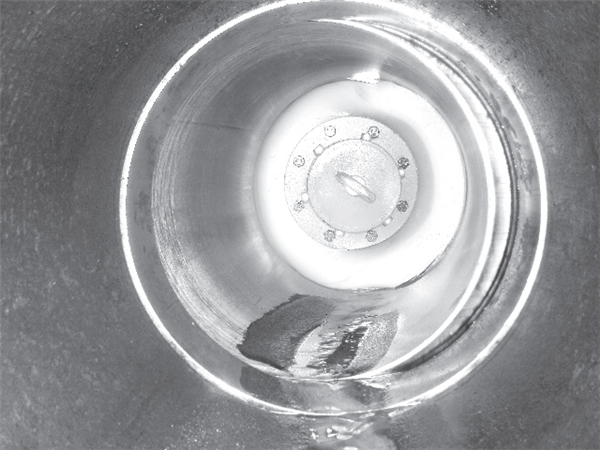 通過(guò)MOV016球閥一側可以清晰看到清管器位置及卡阻情況:清管器距MOV016球閥(閥門(mén)通徑252mm)出口一側法蘭距離為60cm,清管器的第一片皮碗呈褶皺狀卡在MOV016球閥進(jìn)口一側閥芯處(如圖4所示)。經(jīng)查看,閥門(mén)機械指示位指示開(kāi)度到位,但閥芯實(shí)際開(kāi)度不到位,偏移5~7mm。