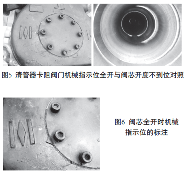 在清管中要避免清管器被卡阻,應對清管器通過(guò)的閥門(mén)進(jìn)行深層次保養和開(kāi)關(guān)測試,如閥門(mén)存在開(kāi)關(guān)不到位或其他缺陷,應該更換新的閥門(mén)。但如果清管工作時(shí)間緊、任務(wù)重,也可由專(zhuān)業(yè)人員重新對閥門(mén)開(kāi)度及機械位進(jìn)行標注,確定閥門(mén)處于全開(kāi)位置。發(fā)球時(shí)將閥門(mén)調至此位置, 確保閥芯處于全開(kāi)(如圖5、圖6所示)。◢