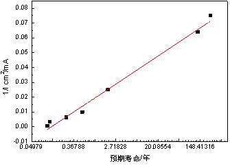 根據材料在不同陰極保護電流密度下的特征壽命值,可以建立特征壽命與加速參數之間的關(guān)系曲線(xiàn),如下圖所示,從而建立基于陰極剝離的預期壽命模型。