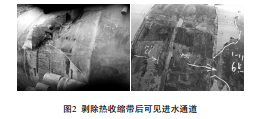 開(kāi)挖檢測中還發(fā)現,有的補口在剝除熱熔膠層時(shí)其與PE粘結呈現不連續狀態(tài),即熱熔膠與PE層粘結不緊密,經(jīng)過(guò)長(cháng)期的埋設,地下水沿著(zhù)熱熔膠與PE界面逐漸滲透至補口管體表面,如果管體無(wú)溶劑環(huán)氧底漆厚度較薄,在腐蝕性較強的地區,久而久之會(huì )導致底漆剝離和管體的腐蝕。圖2中熱收縮帶熱熔膠與PE局部未粘結處可見(jiàn)明顯的進(jìn)水通道。