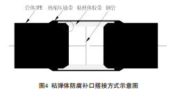采用粘彈體進(jìn)行補口修復時(shí),先對補口部位進(jìn)行清理和打磨,然后加工出溝槽,粘彈體與管體防腐層搭接寬度不小于50mm。粘彈體防腐補口搭接方式如圖4所示。