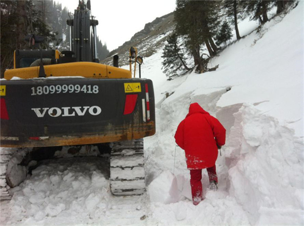 測試經(jīng)過(guò): 前100米挖掘機進(jìn)行深度開(kāi)挖,直至可見(jiàn)伴行路路面,裝載機在后清雪,效果較好,但清雪進(jìn)度取決于挖掘機的速度。在積雪厚度約40厘米,伴行路寬4~4.5米的情況下,挖掘機的行進(jìn)速度約為2米/分鐘;而在拐彎處,由于風(fēng)吹雪和雪崩的影響,積雪厚度約1米,挖掘機的行進(jìn)速度降到大約1米/分鐘。之后減小挖掘機挖掘深度,不再挖掘到伴行路路面,挖掘機行進(jìn)速度提升為3~5米/分鐘。但在這種情況下裝載機輪胎嚴重打滑并失控,無(wú)法繼續進(jìn)行作業(yè)。
