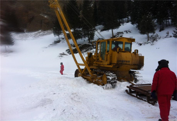 測試經(jīng)過(guò): ZL50輪式裝載機在伴行路積雪厚度僅10厘米地段,四驅四輪均無(wú)抓地力,四輪打滑無(wú)法完成伴行路清雪和設備拉運工作。 VOLVO搶險車(chē)(四驅?zhuān)、東風(fēng)天龍10噸自卸吊(兩驅?zhuān)┰诎惭b防滑鏈后負載僅有一半的情況下,無(wú)法在積雪厚度10厘米有坡度的伴行路上正常行進(jìn),車(chē)輛側滑明顯,根本無(wú)法安全行進(jìn),因此輪式車(chē)輛全部退出測試現場(chǎng)。隨后又測試了自制爬犁拉運,相比效果較好,但考慮到坡度的原因,將爬犁與設備實(shí)施硬連接,同時(shí)將爬犁輕量化,降低爬犁自身高度及拉運設備的重心,會(huì )更加安全可靠(見(jiàn)圖5)。