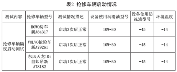 測試經(jīng)過(guò): 夜間將3種不同型號、規格的搶修車(chē)輛停放在果子溝伴行路入口14小時(shí),期間未進(jìn)行發(fā)動(dòng)預熱。次日對3輛車(chē)進(jìn)行啟動(dòng),啟動(dòng)情況見(jiàn)表2。