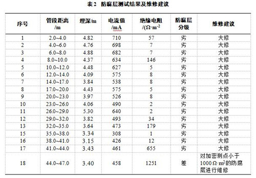 測試與評價(jià)參考標準為SY/T 5918—2004《埋地鋼質(zhì)管道外防腐層修復技術(shù)規范》,對應分級標準見(jiàn)表1。