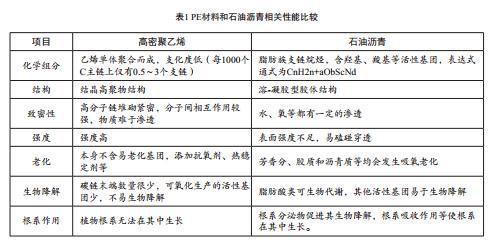 3PE是現階段我國新建管道選用最多的管道外防腐層,本世紀我國修建的西氣東輸一線(xiàn)、陜京二線(xiàn)、西氣東輸二線(xiàn)等大型管道無(wú)一例外均選用3PE涂層為管道外防腐層。3PE的外層為聚乙烯材料,聚乙烯材料屬于非極性結晶高聚物,高分子鏈排列規整,堆砌緊密,分子間相互作用較強,物質(zhì)滲入非常困難;使得氧、水以及其它會(huì )促進(jìn)降解的化學(xué)物質(zhì)難于滲透,聚乙烯材料可耐大多數酸堿及油脂的侵蝕,聚乙烯在室溫不溶于任何溶劑。由于聚乙烯的高相對分子質(zhì)量結構和其憎水性,使得聚乙烯具有良好的抗滲透及抗光氧老化、熱氧老化性,可以有效抵抗各種介質(zhì)及溫度變化的影響;在土壤環(huán)境中,聚乙烯具有很好的抗生物降解性能。在植物適宜生長(cháng)的溫度范圍內(一般不超過(guò)45℃),植物的根系分泌物是難以對聚乙烯材料產(chǎn)生溶脹、溶解等作用的。表1為PE材料和石油瀝青相關(guān)結構及性能的比較。