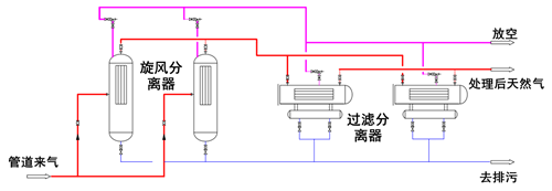 針對塔河油田實(shí)際情況,考慮在現有過(guò)濾器前增加旋風(fēng)分離器,采用旋風(fēng)分離器+過(guò)濾分離器的方式。同時(shí)在天然氣系統其他關(guān)鍵點(diǎn)新增分離+過(guò)濾工藝裝置(見(jiàn)圖4)。