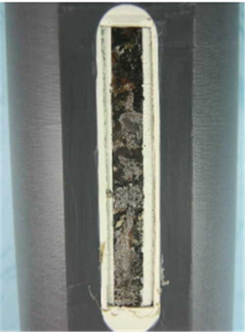 使用ER腐蝕探頭對強交流干擾下管道腐蝕速率進(jìn)行了實(shí)時(shí)監測,監測時(shí)間為2個(gè)月,將ER腐蝕探頭取出后,發(fā)現探頭存在較為嚴重的局部腐蝕現象(圖 2)。采用DDC-II型點(diǎn)腐蝕探測儀對探頭表面3個(gè)位置處的局部腐蝕速率進(jìn)行檢測,結果見(jiàn)表 4,遠超ASTM標準中規定的10 μm/a限值。管道交流腐蝕風(fēng)險較高,亟需對其進(jìn)行緩解。此外,通過(guò)ER探頭測試結果可知試片的平均腐蝕速率為360 μm/a,這相當于0.31 A/m2的直流電流的腐蝕量。而此處的交流電流密度為488.07 A/m2,表明約0.06%的交流電流密度產(chǎn)生了腐蝕。