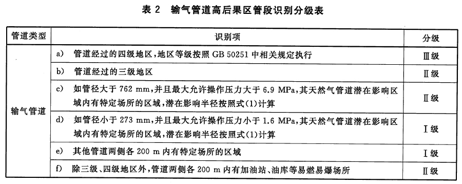 參照第五條:其他管道兩側各200 m范圍內有特定場(chǎng)所的區域?梢岳斫鉃榻橛273~762 mm管徑之間、壓力1.6~6.9 MPa的管道兩側中心線(xiàn)各200 m內有三四級地區的管段為高后果區。