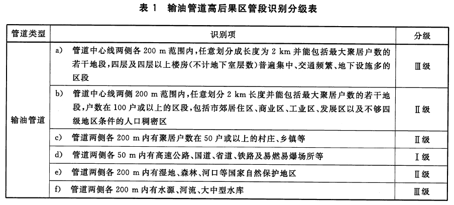 目前管道企業(yè)開(kāi)展高后果區識別工作主要依據《油氣輸送管道完整性管理規范》(GB32167―2015),其中第6章對高后果區的識別、管理有明確規定。輸油管道、輸氣管道識別準則分別見(jiàn)表 1、表 2。