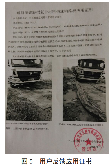 北京華油慧通管道技術(shù)服務(wù)有限公司和天津耐斯工程技術(shù)有限公司自2016年起歷時(shí)兩年開(kāi)展輕型復合材料快速鋪路板研發(fā),經(jīng)過(guò)多次現場(chǎng)模擬試驗,產(chǎn)品最終達到檢驗標準要求,通過(guò)了國家化學(xué)建筑材料測試中心在不同野外環(huán)境下的碾壓測試,主要包括泥地、水泥路、碎石路、土路及泥沼地帶等路況下的性能檢測。值得一提的是,該產(chǎn)品使用后經(jīng)過(guò)簡(jiǎn)單修復還能繼續正常使用并同時(shí)通過(guò)了測試(圖 1)。該產(chǎn)品已獲頒國家實(shí)用新型專(zhuān)利證書(shū)(圖 2)。
