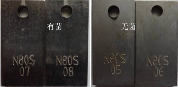 根據NACE RP0775―2005,從表 2可以看出:①N80S在無(wú)菌環(huán)境中腐蝕速率為0.021 mm/a,有菌環(huán)境中的腐蝕速率是無(wú)細菌環(huán)境中的8.48倍,分別屬于輕度腐蝕和嚴重腐蝕。②N80在無(wú)菌環(huán)境中腐蝕速率為0.114 mm/a,有菌環(huán)境中的腐蝕速率是無(wú)細菌環(huán)境中的1.31倍,分別屬于中度腐蝕和嚴重腐蝕。③BG90SS在無(wú)菌環(huán)境中腐蝕速率為0.102 mm/a,有菌環(huán)境中的腐蝕速率是無(wú)細菌環(huán)境中的1.41倍,分別屬于中度腐蝕和嚴重腐蝕。④L245N在無(wú)菌環(huán)境中腐蝕速率為0.023 mm/a,有菌環(huán)境中的腐蝕速率是無(wú)細菌環(huán)境中的9.65倍,分別屬于中度腐蝕和嚴重腐蝕。⑤L360NS在無(wú)菌環(huán)境中腐蝕速率為0.128 mm/a,有菌環(huán)境中的腐蝕速率是無(wú)細菌環(huán)境中的1.71倍。均屬于嚴重腐蝕。試片表面為均勻腐蝕,部分存在點(diǎn)蝕,如圖 3所示。