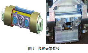 掃描探傷儀的視頻光學(xué)系統提供在線(xiàn)視覺(jué)檢測,提供5 m/min視頻外觀(guān)檢查數據。視頻光學(xué)系統包括一個(gè)500萬(wàn)像素矩陣的高清攝像頭和一個(gè)180°拾取角度的攝像鏡頭,兩個(gè)LED射燈和垂直平面模塊,可同時(shí)在掃描探傷時(shí)驅動(dòng)和啟動(dòng),如圖 7所示。其同時(shí)帶有兩個(gè)位于正面和背面的類(lèi)似的視頻光學(xué)系統單元,在小直徑管道(小于DN 500 mm)內,掃描探傷儀無(wú)法轉動(dòng),則需要第二臺攝像機相對掃描探傷儀反向移動(dòng)。該模塊還包括甲烷濃度測量傳感器和投射激光器。
