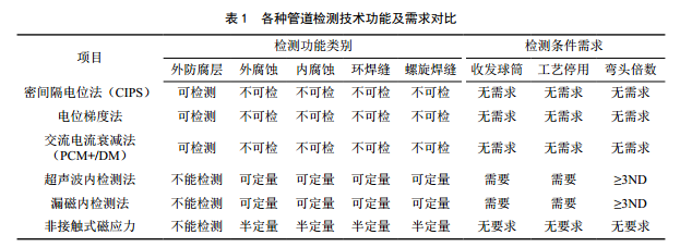 非接觸式磁應力檢測(PMT檢測)是一種無(wú)損外檢測方法,基本原理是利用金屬磁記憶效應來(lái)檢測部件應力集中部位,采集數據并開(kāi)挖幾個(gè)校驗坑即可完成,并可得出較為豐富的缺陷數據和評估結果,達到部分漏磁檢測效果。各種檢測技術(shù)對比見(jiàn)表 1。