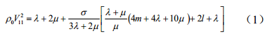 V11是平行于加載方向的波傳播速度; ρ0是材料沒(méi)有應力下的初始密度; λ,μ 是二階彈性模量;ι,m ,n 是三階彈性模量; ε 是加載方向上的應變;ν 是泊松比。