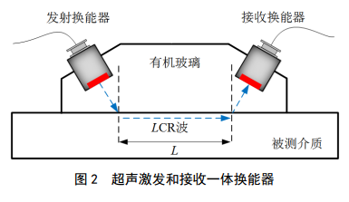 超聲激發(fā)和接收一體換能器如圖 2所示,有機玻璃楔塊中有一個(gè)激發(fā)換能器和一個(gè)接收換能器,聲程L 固定為35 mm。換能器和被測介質(zhì)的傾斜角為28°,換能器頻率為5 MHz。