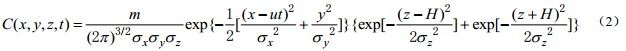 若管道泄漏口為小孔,可認為泄漏為連續泄漏源,采用高斯煙羽模型模擬計算該泄漏氣體的濃度分布,其表達式由式(1)給出: