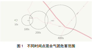 以10%天然氣濃度(窒息危險濃度)為濃度邊界,時(shí)間點(diǎn)分別取10 s、 100 s、 200 s、 400 s,運行天然氣管道事故后果分析工具箱中的高斯煙團模型,不同時(shí)間點(diǎn)混合氣團覆蓋區域如圖 1所示。