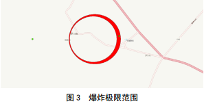 圖 3爆炸極限區域覆蓋面積19 552 m2,在該區域一旦出現明火,將直接導致混合氣團爆炸,爆炸產(chǎn)生的超壓沖擊波將會(huì )造成更大范圍傷害。在當地壓力和溫度下,天然氣密度為0.6 kg/m3,則泄漏的天然氣質(zhì)量為72 000 kg。以點(diǎn)火源為爆炸中心,燃燒熱取甲烷的燃燒熱55 600 kJ/kg, TNT爆炸熱取4 500 kJ/kg,假設泄漏的天然氣全部參與爆炸,則根據表 1中沖擊波超壓值運行爆炸模型,爆炸超壓波影響建筑物范圍如圖 4所示。