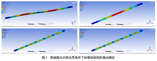 使用有限元建模計算管道固有頻率,規定載荷和邊界條件,進(jìn)行懸跨模態(tài)分析,確定結構的固有頻率、振型以及振型的參與系數。管道的高階振動(dòng)可能會(huì )引發(fā)管道共振現象。因此,應對懸跨管道多階的固有頻率進(jìn)行分析(圖 2),找出內、外流因素影響下的懸跨管道振動(dòng)規律。分析過(guò)程不能將海底懸空管段完全等同于兩端固支約束或簡(jiǎn)支約束,還應考慮管土耦合的非線(xiàn)性關(guān)系。