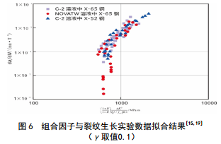 圖 6所示為C-2和NOVATW溶液中X65鋼中裂紋生長(cháng)速率以及C-2溶液中X52鋼中裂紋生長(cháng)速率與加載組合因子的關(guān)系, 其中γ取值為 0.1 時(shí)所有數據擬合結果較好。擬合的組合因子在X軸上存在一個(gè)門(mén)檻值500 MPa·m0.5,低于這個(gè)門(mén)檻值時(shí),裂紋不會(huì )生長(cháng),呈現惰性;在500到1 000 MPa·m0.5 則為緩慢增長(cháng)階段,屬于裂紋增長(cháng)的激活區;高于1 000 MPa·m0.5為裂紋快速增長(cháng)階段。組合因子的這些門(mén)檻值可以直接用來(lái)預測微觀(guān)裂紋所處的狀態(tài),方便判斷管道所處的狀態(tài)和管道的維護。