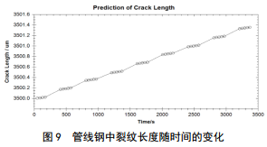 管道中的裂紋長(cháng)度預測值如圖 9所示,裂紋長(cháng)度預測值與管道壁厚的比值達到或者接近于三分之一, 則認為管道接近失效斷裂。管道斷裂裂紋長(cháng)度的門(mén)檻值,取決于管道原始厚度、管材、運行溫度等因素,每種管材都需要通過(guò)實(shí)驗確定其斷裂門(mén)檻值,用于計算剩余壽命。