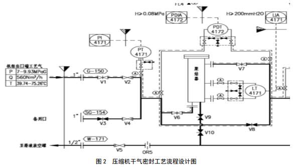 在原干氣密封備用氣源口位置,增加第二路工藝氣源引機組出口匯管工藝氣,增設一個(gè)氣動(dòng)閥門(mén)受壓縮機控制系統控制(圖 2)。當壓縮機組進(jìn)行泄壓后的啟機時(shí),機組出口端工藝氣源已放空,需打開(kāi)該氣動(dòng)閥從壓縮機出口匯管供應一級密封氣,泄壓停機時(shí)需關(guān)閉該氣動(dòng)閥,從而實(shí)現一鍵啟停站時(shí)干氣密封系統的自動(dòng)控制。