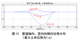 計算結果表明,當最大土體位移為1 m時(shí),管道最大軸向應力約為217 MPa,最大壓應力﹣60.7 MPa,下游段承受較大拉應力, X 3截面附近受力最不利, X2截面為反彎點(diǎn),受力狀態(tài)復雜, X1截面相對安全。