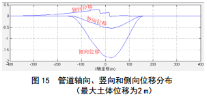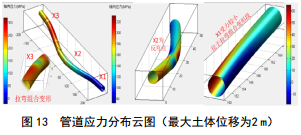 計算結果顯示,當最大土體位移為2 m時(shí),管道最大軸向拉應力約為329 MPa,最大壓應力﹣18.4 MPa,下游段承受較大拉應力, X3截面附近受力最不利, X2截面為反彎點(diǎn),受力狀態(tài)復雜, X1截面相對安全。對比土體位移為1 m時(shí)的計算結果,管道受力變形規律保持不變,但應力與位移增大。詳見(jiàn)圖 13―15。