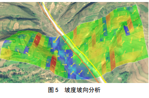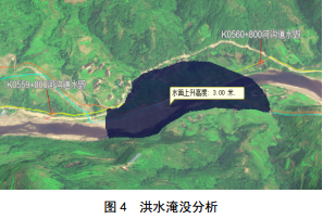 系統通過(guò)與用戶(hù)的交互,實(shí)現對三維場(chǎng)景中的任意范圍內坡度坡向進(jìn)行分析,得出該范圍內的坡度坡向圖,同時(shí)提供單點(diǎn)的坡度坡向信息查詢(xún)。淹沒(méi)分析功能實(shí)現顯示洪水淹沒(méi)面積范圍,可以清楚地確定洪水威脅的地方,對于高程低的地方可以劃為危險區域,無(wú)論對防災減災還是災后處理都有重要參考價(jià)值。見(jiàn)圖 4、圖 5。