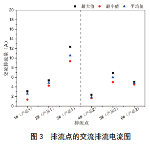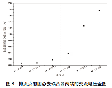 固態(tài)去耦合器兩端的交流電壓差是由通過(guò)的交流和其交流阻抗決定。排流量大和交流阻抗較大時(shí),都會(huì )造成其兩端的交流電壓差大。圖 10為各個(gè)排流點(diǎn)的固態(tài)去耦合器交流阻抗測試結果,可以看出產(chǎn)品2的交流阻抗遠大于產(chǎn)品1, 6#排流點(diǎn)交流阻抗達到 0.37 Ω,如排流點(diǎn)的電流達到產(chǎn)品標稱(chēng)的80 A時(shí),固態(tài)去耦合器兩端的交流電壓差將達到29.6 V,在影響管地電位的同時(shí),也將影響排流點(diǎn)的排流效果,因此在排流量較大時(shí),固態(tài)去耦合器的交流阻抗直接影響排流效果。