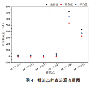 圖 4為固態(tài)去耦合器的直流漏流量的最大值、最小值和平均值,測試結果顯示,產(chǎn)品1的直流漏流量在﹣7 mA~+19 mA(正值表示電流通過(guò)排流地床流出),產(chǎn)品2的直流漏流量在﹣3 mA~+720 mA,其中5#和6#排流點(diǎn)通過(guò)的直流漏流量大。圖 5為固態(tài)去耦合器兩端的直流電壓差,可以看出, 6處直流電壓差均在規定的隔離電壓范圍內(﹣3 V~+0.3 V),但是2家產(chǎn)品的直流漏流量均大于規定的參數(大于1 mA)。