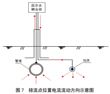 對比排流前后管道電位可以看出(圖 6),1#~4#排流點(diǎn)排流前后管地電位變化不大,表明有較 小直流電流通過(guò)固態(tài)去耦合器時(shí),對管道電位影響不明顯。 5#和6#排流點(diǎn)排流后管道電位負向偏移明顯,分別負向偏移了0.50 V和0.98 V,表明固態(tài)去耦合器連接后,有直流電流流入管道表面,造成管地電位變負。直流漏流量的測試結果顯示, 5#和6#排流點(diǎn)直流漏流量大,有電流通過(guò)排流地床流出,分析管道電位變負時(shí)由于排流地床的流出電流,通過(guò)土壤流回管道的表面,造成管地電位變負,直流電流流動(dòng)方向如圖 7所示。