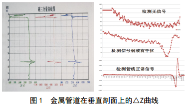 磁梯度測量(又稱(chēng)磁三分量測量)以地下各種介質(zhì)具有不同的磁性差異為物理基礎,采用專(zhuān)用儀器設備測定地面以下(鉆孔周邊一定范圍)一定深度內磁場(chǎng)強度變化情況,獲得磁三分量曲線(xiàn),經(jīng)過(guò)對實(shí)測數據和曲線(xiàn)進(jìn)行分析研究,得出深埋金屬管道在垂直剖面上的△Z 梯度值變化曲線(xiàn)(圖 1)。從圖中可以看出,在靠近深埋金屬管道的鉆孔內, Za 梯度值隨深度變化很明顯,在接近深埋金屬管道位置時(shí),△Z 梯度值變化非常劇烈,梯度值曲線(xiàn)呈“S”形。在稍微遠離深埋金屬管道位置后,△Z梯度值的變化幅度相應減小,當探測鉆孔與金屬管道的水平距離大于1.0 m時(shí),梯度值幾乎不變化。一般來(lái)說(shuō),當△Z為“S”型曲線(xiàn),金屬管道的中心位置位于△Z梯度值的最大值與最小值之間;當△Z 為“C”型曲線(xiàn),△Z 曲線(xiàn)的極小值位置判斷為金屬管道的中心位置。在實(shí)際工程中,已成孔的探測孔將磁梯度儀下放到鉆孔內,自下而上探測金屬管道在鉆孔深度內的△Z 梯度值,并將數據繪制成曲線(xiàn),根據△Z 梯度值曲線(xiàn)變化來(lái)判定深埋管線(xiàn)的平面位置和埋深。