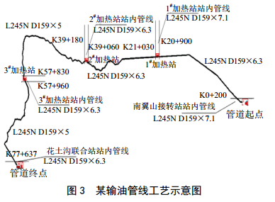 監測管道長(cháng)80 km,管線(xiàn)規格為D159×6.3,材質(zhì)為L(cháng)245N無(wú)縫鋼管,輸送介質(zhì)為凈化原油,管道高程為2 719 m~3 377 m。其工藝示意圖見(jiàn)圖 3。