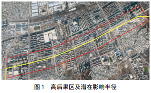 通過(guò)實(shí)地調研,該管段約4 km敷設在人行道下方,管道兩側200 m范圍內樓房、人口密集,住戶(hù)約11 000多戶(hù)、二級甲等綜合醫院1家、學(xué)校1所(約1 800名學(xué)生)、小規模幼兒園2所、雜貨市場(chǎng)1個(gè)、辦公大樓多幢,總人口約35 000~45 000人。根據GB 50251―2014《輸氣管道工程設計規范》的規定,該管段地區等級在設計施工階段因周邊建構筑物和人員較少,定為二級地區,現已升為四級地區。同時(shí),根據GB 32167―2015《油氣輸送管道完整性管理規范》規定,將該管段評定為III級高后果區管段,其潛在影響半徑為管道兩側200 m,如圖 1所示。