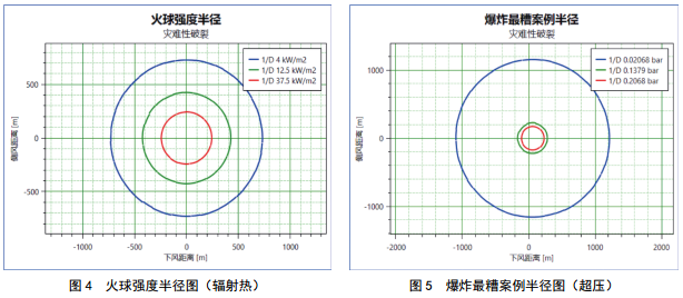 管線(xiàn)輸送介質(zhì)為易燃、易爆的天然氣,發(fā)生火災爆炸事故時(shí)產(chǎn)生的沖擊波將對人員、財產(chǎn)、建筑物及大氣環(huán)境產(chǎn)生一定影響。利用PHAST軟件,對可能發(fā)生的泄漏和可能產(chǎn)生的事故進(jìn)行定量分析。以管道完全破裂下的天然氣擴散、爆炸輻射熱半徑和超壓強度半徑進(jìn)行分析,如圖2-5所示。