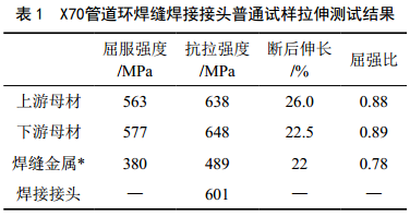 焊接接頭普通試樣拉伸試驗顯示斷裂均發(fā)生在焊縫區位置,結果見(jiàn)表 1。結果表明,焊接接頭抗拉強度的最小值為601 MPa,滿(mǎn)足標準中對焊接接頭抗拉強度的要求(不低于同級別母材抗拉強度的下限值570 MPa)。焊縫金屬屈服強度遠低于母材的屈服強度,焊縫金屬抗拉強度低于焊接接頭的抗拉強度。焊接接頭兩側母材對焊縫金屬存在一定的拘束,使得焊接接頭整體表現出的抗拉強度大于焊縫金屬的抗拉強度。